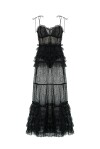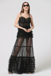 Long transparent dress in lace and rouches, model with boned bustier, adjustable straps, ruffled skirt on the front, wide skirt with final flounce with rouches, zip closure on the back. The texture of the dress is in lace decorated with fabric polka dots for a feminine and sexy effect.