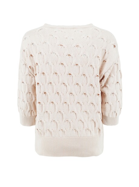 Round neck sweater, woven model with mesh effect with small openings, three-quarter sleeves with vanisè bottom, beige color.