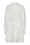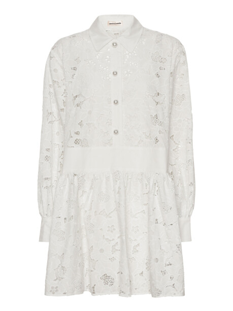 Dress in 100% cotton embroidered with a perforated floral motif. Wide model with shirt collar, front buttoning with pearl-shaped jewel buttons; same type of buttons also on the cuffs. The dress comes with a petticoat. White in color.