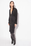 Longuette dress with logoed jacquard blouse top, with deep V-neck crossed in front and long sleeves with cuffs at the bottom. Fitted longuette skirt in black stretch denim with a row of metal nail buttons on the front.