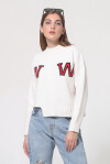 Asymmetrical sweater with crater collar, College style. Short model with lettering decorations on the front.