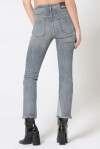 Five-pocket flare jeans, medium-waisted model in comfort blue denim, light vintage wash with rips and contrasting side wedges on the bottom; zip closure.