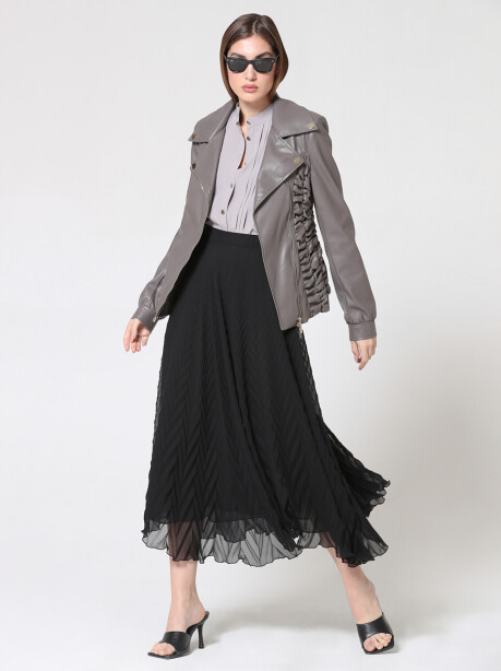 High-waisted pleated skirt, in black color, mid-leg length. Invisible zip closure on the back.