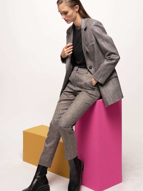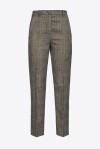 Pantaloni cigarette-fit slim in viscosa stretch con fantasia Principe di Galles, nei toni del nero, del marrone e del bianco. Tasche alla francese davanti e a filetto sul retro. Vita con passanti per cintura, chiusura con zip e piccolo gancio.