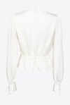 Blusa femminile in raso di misto seta martellato, di colore bianco. Scollo a V con laccetti, maniche lunghe con polsino volant al fondo e laccetto a fondo capo per personalizzarne la portata.