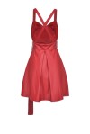 Vestito corto senza maniche in similpelle con spalline sottili che incrociano sul retro e gonna dal volume leggermente ampio, di colore rosso. Dettaglio con borchie sulla parte frontale e chiusura nascosta davanti.