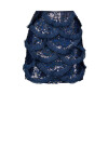 Minigonna aderente interamente ricamata full paillettes con frange che creano motivo decorativo, sia davanti che sul retro, nei toni sfumati del blu. Foderata. Chiusura con zip invisibile nel centro dietro.