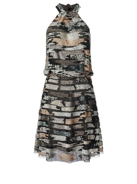 Abito corto senza maniche in tulle con ricamo asimmetrico in paillettes, nei toni del nero dell'ecrù e dell'argento. Scollo all'americana allacciato con fiocco sul retro, elastico in vita e minigonna dal volume fluido. Foderato. Chiusura con zip invisibile nel centro dietro.