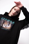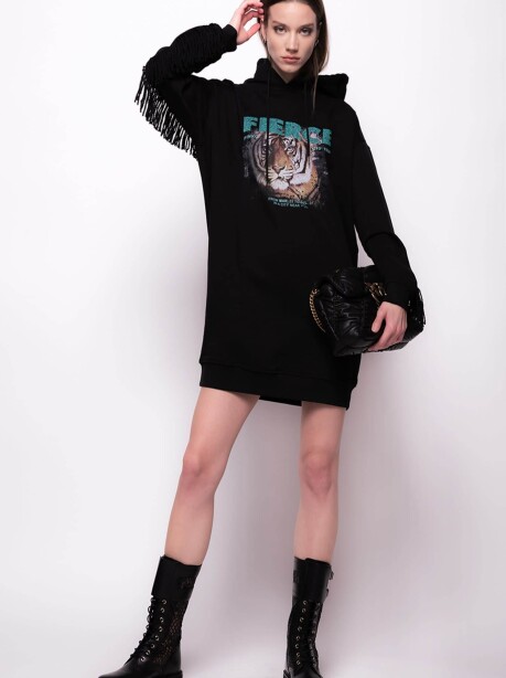 Vestito in felpa in cotone con stampa tigre "Fierce" e ricamo lurex davanti, di colore nero. Collo a cappuccio con coulisse, maniche lunghe e sprone dietro profilati con frange.
