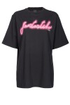 T-shirt dal volume oversize a mezze maniche in jersey di cotone con stampa Fantastiko effetto scritta al neon nel centro davanti, di colore nero e fucsia.
