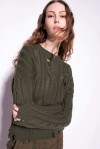 Pullover in filato di misto viscosa lavorato a coste con maxi trecce dal particolare effetto "used" consumato, caratterizzato da strappi e segni di usura, di colore verde militare. Scollo tondo e maniche lunghe a giro basso.