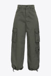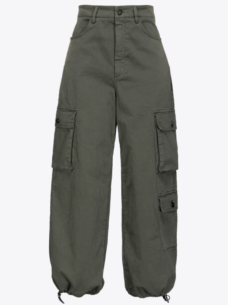 Pantaloni cargo in gabardina di cotone stretch, di colore verde militare. Vita alta con passanti per cintura, tasche davanti, tasche a toppa applicate sul retro e maxi tasche stile utility laterali. Gamba dalla linea oversize con coulisse elastica a fondo gamba. Chiusura con zip e bottone.