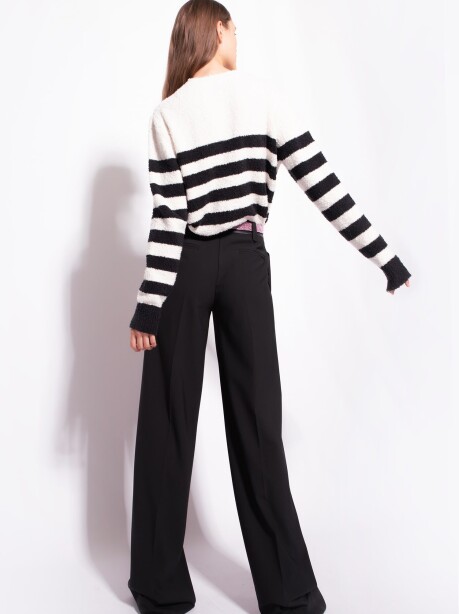 Pullover in morbido filato di cotone eco effetto spugna con motivo a righe caratterizzato da intarsio con cuore davanti, lato cuore, nei toni del nero, del bianco e del rosso. Scollo tondo e maniche lunghe.