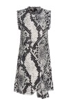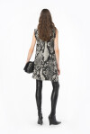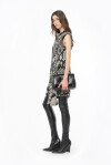 Abito corto senza maniche in maglia jacquard con disegno snake, nei toni del bianco e del nero. Scollo tondo profilato da fettuccia effetto pelle con borchie applicate e dettaglio annodato a fondo capo. Profili sfrangiati. Chiusura con zip invisibile nel centro dietro.