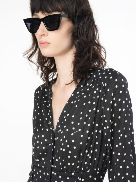 Vestito chemisier lungo in tessuto jacquard, con fantasia a pois irregolare, nei toni del nero e del bianco. Scollo a V, maniche lunghe con polsino al fondo e punto vita evidenziato da cintura abbinata nello stesso tessuto. Gonna lunga scivolata dalla silhouette costruita a balze. Foderato. Chiusura con bottoni davanti.