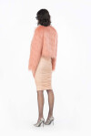 Vestito longuette in pizzo stretch, caratterizzato da pattern floreale e doppio smerlo. Linea aderente con scollo caratterizzato da motivo torchon davanti, scollo dritto sul retro e maniche lunghe leggermente a sbuffo, di colore rosa cammeo. Motivo di drappeggio su tutta la lunghezza dell'abito. Il bustino e la gonna sono foderati, mentre le maniche sono lasciate in trasparenza. Chiusura con zip invisibile nel centro dietro.