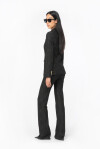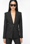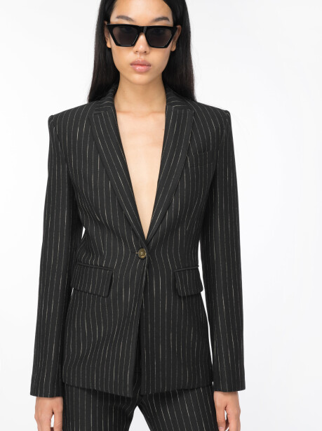 Blazer dal taglio slim in tessuto tecnico di viscosa stretch lavorato a punto stoffa, gessato, di colore nero e beige. Collo con piccoli revers a lancia, taschino a filetto davanti, lato cuore, e tasche con patta applicata sui fianchi. Foderata. Chiusura monopetto con bottone singolo in metallo.