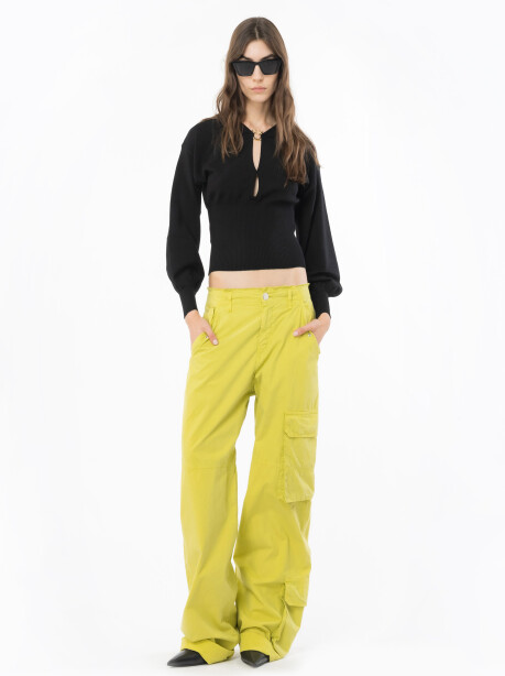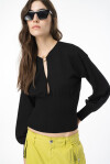Maglia in morbido filato di lana stretch, di colore nero. Linea fluida, con scollo tondo caratterizzato da cut-out e mini fibbia Love Birds in metallo dorato, maniche lunghe a giro basso dal volume ampio. Polsini e fascia a fondo capo, che stringe leggermente il volume della maglia, lavorate a costine.