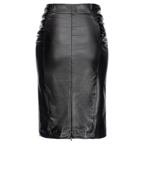 Midi skirt with a tight pencil silhouette in leather-effect fabric. Gathered details on the front and sides, central slit at the bottom on the back closed with an invisible zip, which allows you to customize the opening. Metal zip closure on the front.