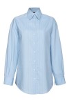 Classic cut shirt in cotton poplin with very thin vertical stripes. Pointed collar, long sleeves with slightly low set-in, with cuff completed by laces at the hem. Button closure on the front.