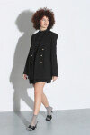Short dress in microcrêpe characterized by a motif of fringed lines all over the garment and flounce at the bottom, in black. Slightly high collar and long sleeves. Lace rouches, lined, with invisible zip closure and hook on the back. Made of 100% polyester, with a slim regular fit.