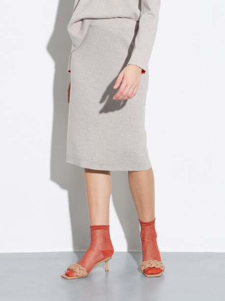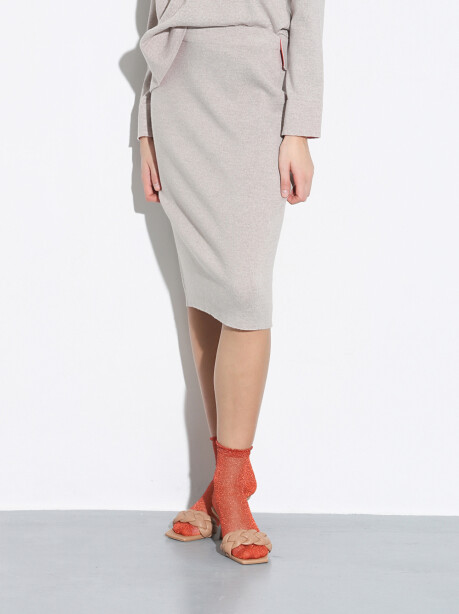 A fitted longuette skirt in fabric stitch, in cappuccino color, with a slight slit on the back. A garment with a fit that can range from slim to comfort, made of 100% virgin wool.