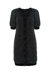 Black lurex knit dress, short model above the knee, three-quarter perforated sleeves, finished with satin-effect edging and buttons on the front.
