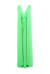 Vestito lungo con spacchi laterali sulle spalle che cadono lungo le braccia, scollo a V sul fronte e sul retro, la gonna si stringe leggermente in vita per cadere dritta e fluida fino al fondo morbido, spacco laterale, chiusura sul retro con zip, di colore verde mela dai toni fluo.