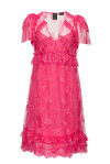 Abito corto in pizzo caratterizzato da profili e dettagli con rouches. Scollo a V, mezze maniche ad aletta, taglio alto in vita e balze a fondo capo. Completo di sottoveste abbinata funzione fodera.