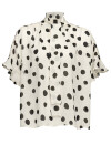 Blusa leggera, corta, dal volume boxy in tessuto jacquard con stampa macro pois dai contorni leggermente irregolari all-over. Colletto in piedi con fusciacca da annodare e maniche corte con volant al fondo.