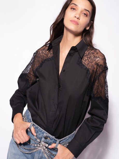 Camicia dal volume leggermente oversize in popeline di cotone con inserto in pizzo sulle spalle. Colletto classico, maniche lunghe a giro basso con polsini al fondo e fondo capo stondato. Chiusura nascosta con bottoni.