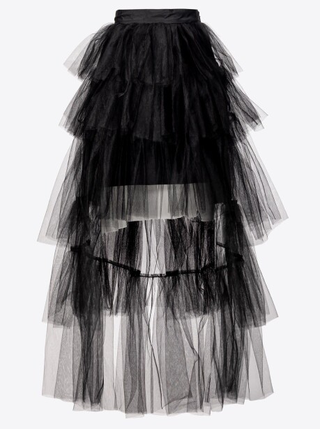 Gonna dal volume ampio realizzata con balze di tulle a strati, più corta davanti e più lunga sul retro. Fascia effetto cintura in vita e chiusura con zip invisibile laterale.