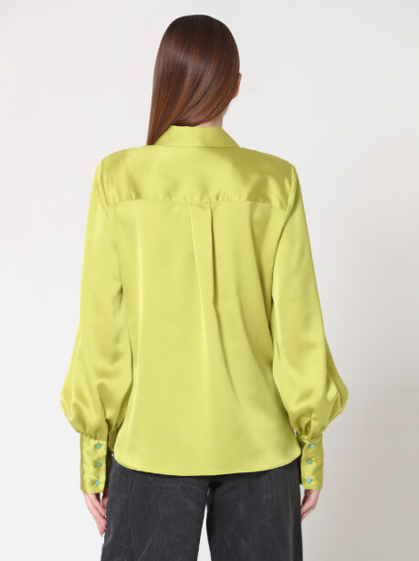 Camicia in raso con spalline e maniche lunghe a sbuffo sul fondo completate da polsino, di colore verde acido. Chiusura con bottoni sul fronte.