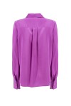 Camicia in raso con spalline e maniche lunghe a sbuffo sul fondo completate da polsino, di colore viola. Chiusura con bottoni sul fronte.