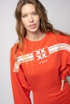 Mini dress in felpa garzata di cotone con stampa Love Birds e bande sporty davanti. Scollo tondo, maniche lunghe a giro basso e gonna corta aderente, di colore rosso.