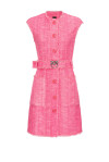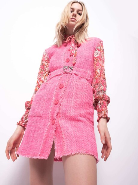 Abito corto senza maniche in stuoia di cotone dal particolare effetto maltinto con profili sfrangiati, di colore rosa acceso. Cintura abbinata nello stesso tessuto con fibbia Love Birds Diamond Cut e tasche a toppa applicata davanti. Chiusura con bottoni davanti. Realizzato con materiale sostenibile che contiene fibre riciclate da scarti tessili, con l'obiettivo di ridurre le risorse impiegate e costruire un processo circolare.