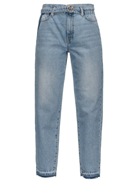 Jeans cinque tasche mom-fit in denim vintage, di colore blu chiaro. Vita alta con passanti per cintura, cintura abbinata nello stesso tessuto con mini fibbia Love Birds ed elastico con arriccio sul retro. Gamba dalla linea dritta, leggermente più stretta al fondo, con fondo capo tinto a riserva e tagliato al vivo. Logo Love Birds su una delle due tasche sul retro. Chiusura con zip e bottone in metallo.