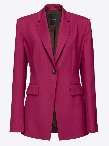 Blazer dalla linea dritta in lana tecnica, di colore fucsia. Collo a rever e tasche con patta applicata. Foderato. Chiusura monopetto con bottone singolo.
