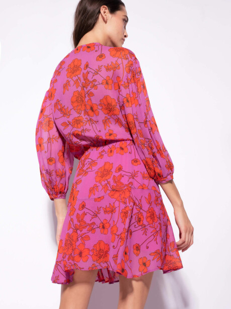 Abito corto in leggera georgette di viscosa lurex a stampa fiore grafico bicolore, nei toni del fucsia e del rosso. Scollo a V incrociato davanti, maniche lunghe a giro basso con piccolo polsino al fondo ed elastico in vita. Gonna corta con incrocio e balza al fondo. Foderato.