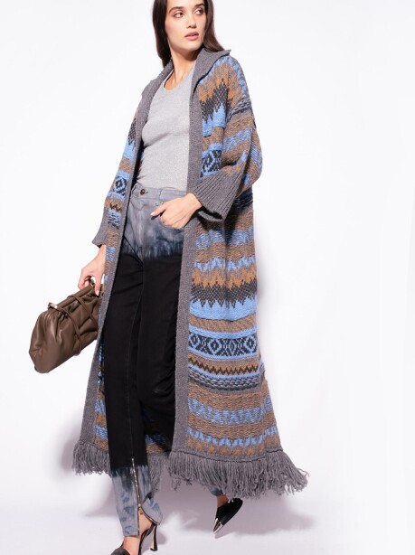Maxi cardigan da usare come cappotto in maglia di misto alpaca con disegno fantasia a righe, nei toni del grigio e dell'azzurro. Collo alto aperto, maniche lunghe ampie a giro basso e cintura abbinata nello stesso tessuto da annodare in vita. Profili cintura e fondo capo si caratterizzano per effetto sfrangiato.