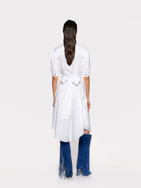 Vestito chemisier midi in popeline di cotone, di colore bianco. Colletto a camicia, taschini con patta a punta davanti, caratterizzati da gioco di pieghe e mezze maniche a palloncino con polsino al fondo. Cintura a fusciacca abbinata nello stesso tessuto da annodare in vita, con gonna midi a pieghe dal volume morbido con tasche inserite sui fianchi e orlo a punta sul retro. Chiusura con bottoni davanti. - La modella è alta 178cm e indossa una taglia 40.