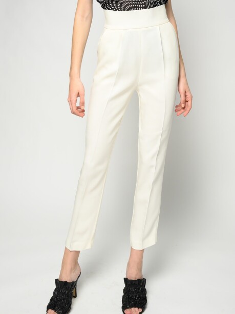 Pantaloni a vita alta in crêpe di viscosa stretch. Linea morbida con gamba dritta, pence davanti e motivo di piega stirata davanti e dietro, tasche alla francese, di colore bianco vaniglia. Chiusura con zip invisibile nel centro dietro.