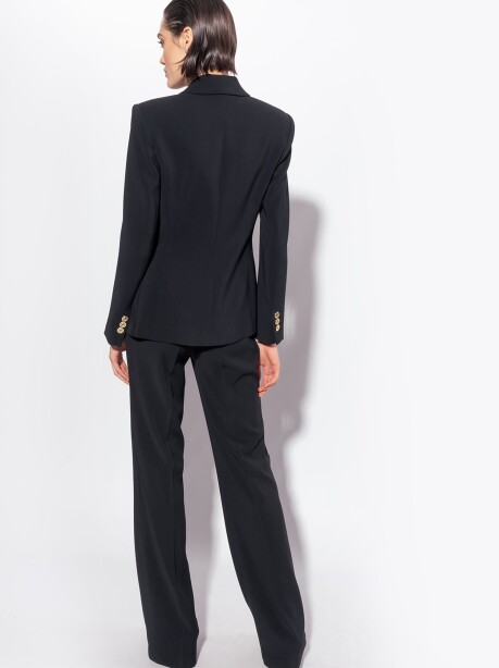 Blazer femminile in tessuto crêpe stretch, di colore nero. Linea avvitata, più stretta sui fianchi, con collo a rever, maniche lunghe con bottoni al fondo, tasche con patta applicata. Foderato. Chiusura monopetto con bottone singolo. - La modella è alta 175cm e indossa una taglia 40.