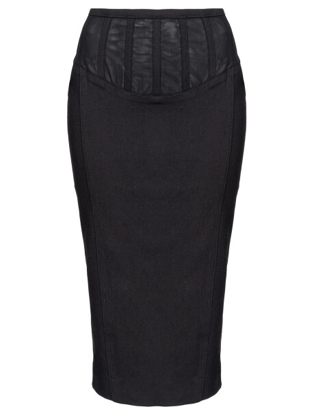 Gonna jeggings aderente con vita alta di ispirazione bustier caratterizzato da inserti in tela e spacco centrale al fondo sul retro, di colore nero. Chiusura con zip laterale.