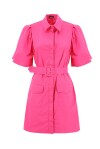 Chemisier con cintura in vita regolabile; modello con colletto camicia e tasche frontali. Maniche ampie, leggermente a farfalla, lunghezza gonna sopra al ginocchio. Piccolo oblò sulla schiena.