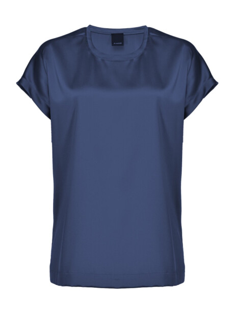 Top a maniche corte in raso di seta stretch, con collo a giro e fondo capo leggermente stondato sul retro di colore blu scuro.