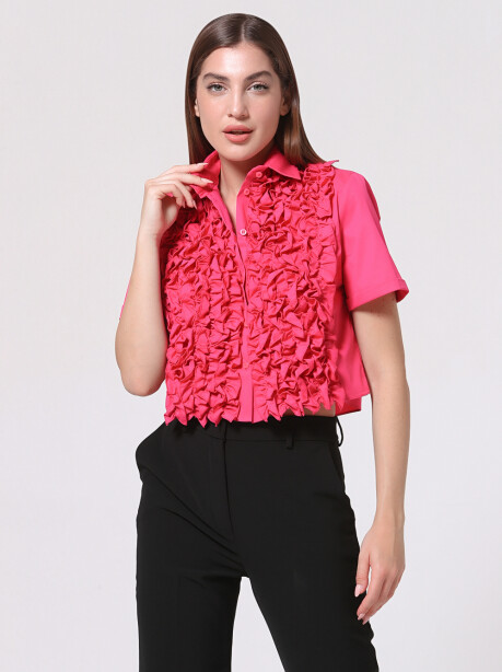 Camicia modello crop a maniche corte con lavorazione di rouches su tutto il fronte. Collo camicia classico, bottoni frontali e taglio boxy squadrato.
