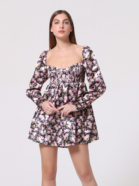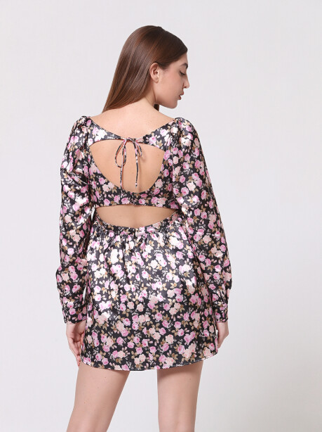 Mini dress stampato a fantasia floreale a maniche lunghe; modello con scollatura squadrata e coppa leggermente a cuore. Gonna corta, morbida e leggermente svasata. Diversi oblò sulla schiena ricreati attraverso due abbottonature: una tramite lacci e una tramite bottoncini.