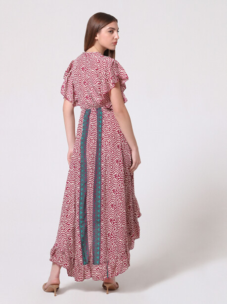 Vestito lungo con maniche corte a sbuffo e balze, realizzato a mano in morbida seta indiana in fantasia Picche fucsia. Con scollo a V, elastico sotto il giro seno e schiena da cui inizia la particolarissima gonna leggermente svasata con balze, corta davanti e lunga lateralmente e dietro.