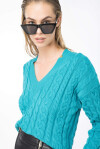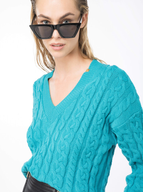 Maglioncino dal volume boxy in maglia di misto viscosa stretch lavorata con mix di trecce. Leggero scollo a V personalizzato con placchetta logo Love Birds, polsini e fondo capo lavorati a costine.
